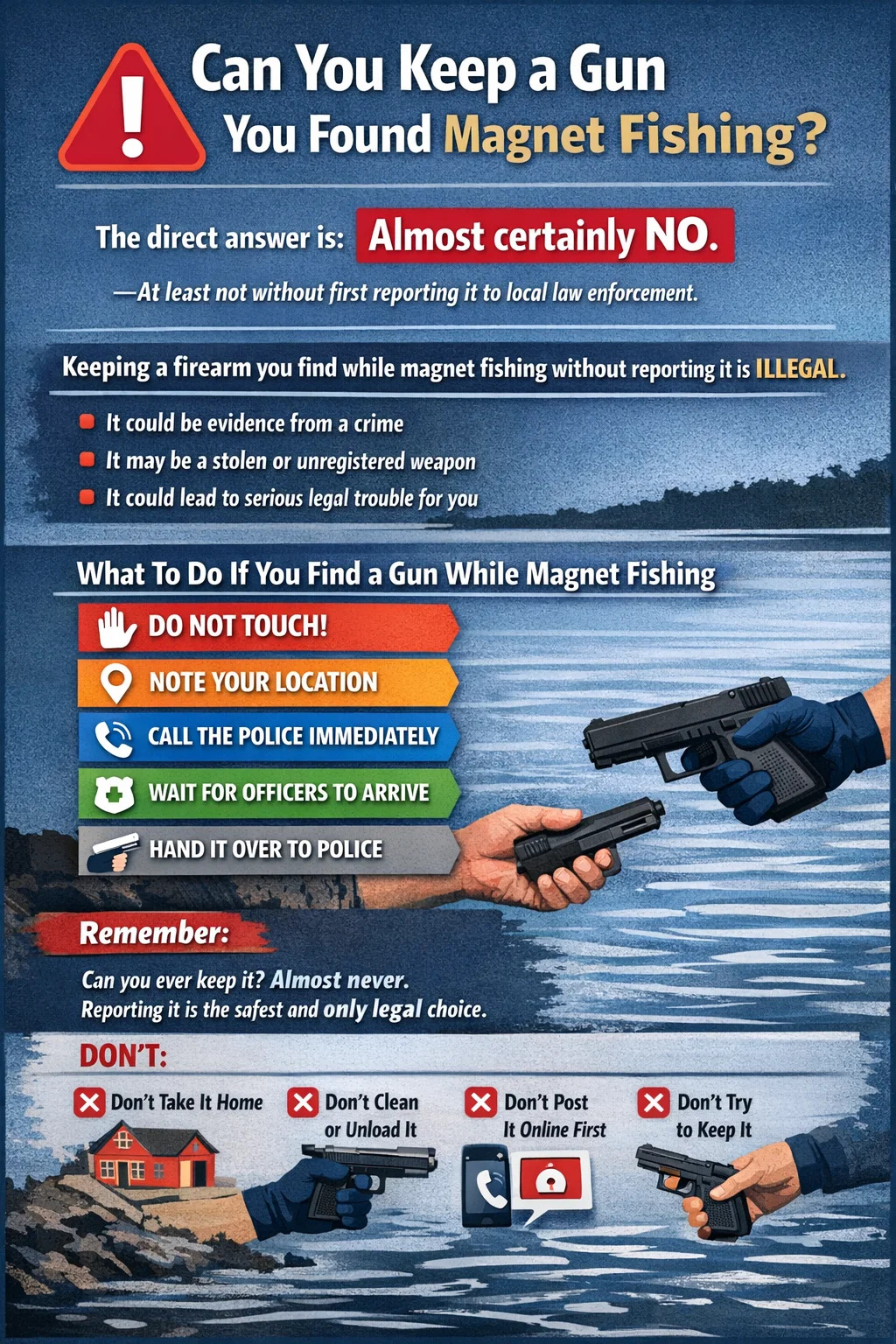Kısa cevap: neredeyse kesinlikle hayır - en azından bunu ilk önce yerel kolluk kuvvetlerine bildirmeden. Çoğu ABD eyaletinin yanı sıra Birleşik Krallık, Kanada ve Avustralya'da, sudan çıkardığınız bir ateşli silahı, balık tutma mıknatısıyla bildirmeden tutmak yasa dışıdır. Silah bir suça delil olabilir, çalındığı bildirilmiş olabilir ya da kayıtsız bir silah olabilir; bunlardan herhangi biri, onu alıp gitmeye karar verdiğiniz anda sizin için ciddi yasal risk oluşturur.
