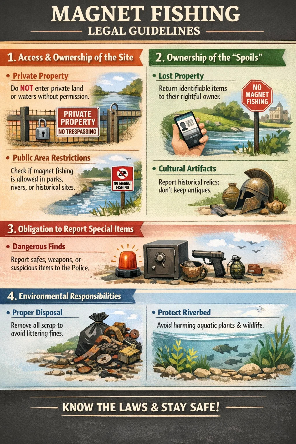 Mıknatıs avcılığına başlamadan önce ilgili yasa ve düzenlemeleri anlamak çok önemlidir. Bu faaliyet birçok yerde çevreyi temizlemenin olumlu bir yolu olarak görülse de yasal olarak arazi hakları, geri alınan eşyaların mülkiyeti ve kamu güvenliği gibi çeşitli hususları içermektedir.