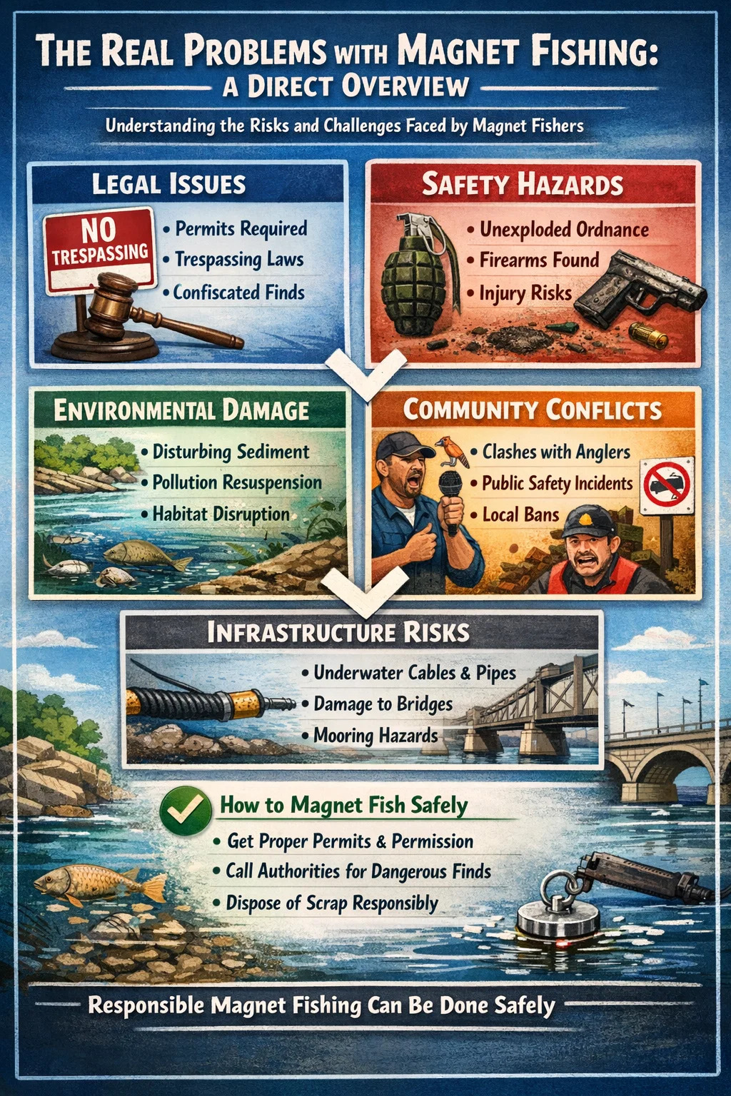 Mıknatıs balıkçılığının bir takım gerçek sorunları vardır ve bunlar yeni başlayanların çoğunun beklediğinden daha ciddidir. Hobi, sudan demir içeren metal nesneleri çıkarmak için güçlü bir neodimyum balıkçılık mıknatısını nehirler, kanallar, limanlar ve göller boyunca sürüklemeyi içerir. İlk bakışta zararsız bir açık hava etkinliği gibi görünüyor ve pek çok açıdan öyle. Ancak beraberinde gelen sorunlar arasında yasal maruz kalma, fiziksel tehlike, çevresel zarar, kamu güvenliği riskleri ve topluluk çatışmaları yer alıyor. Bu sorunların hiçbiri varsayımsal değil; hepsi birden fazla ülkede yaralanmalara, tutuklamalara, para cezalarına ve halka açık yasaklara yol açtı.