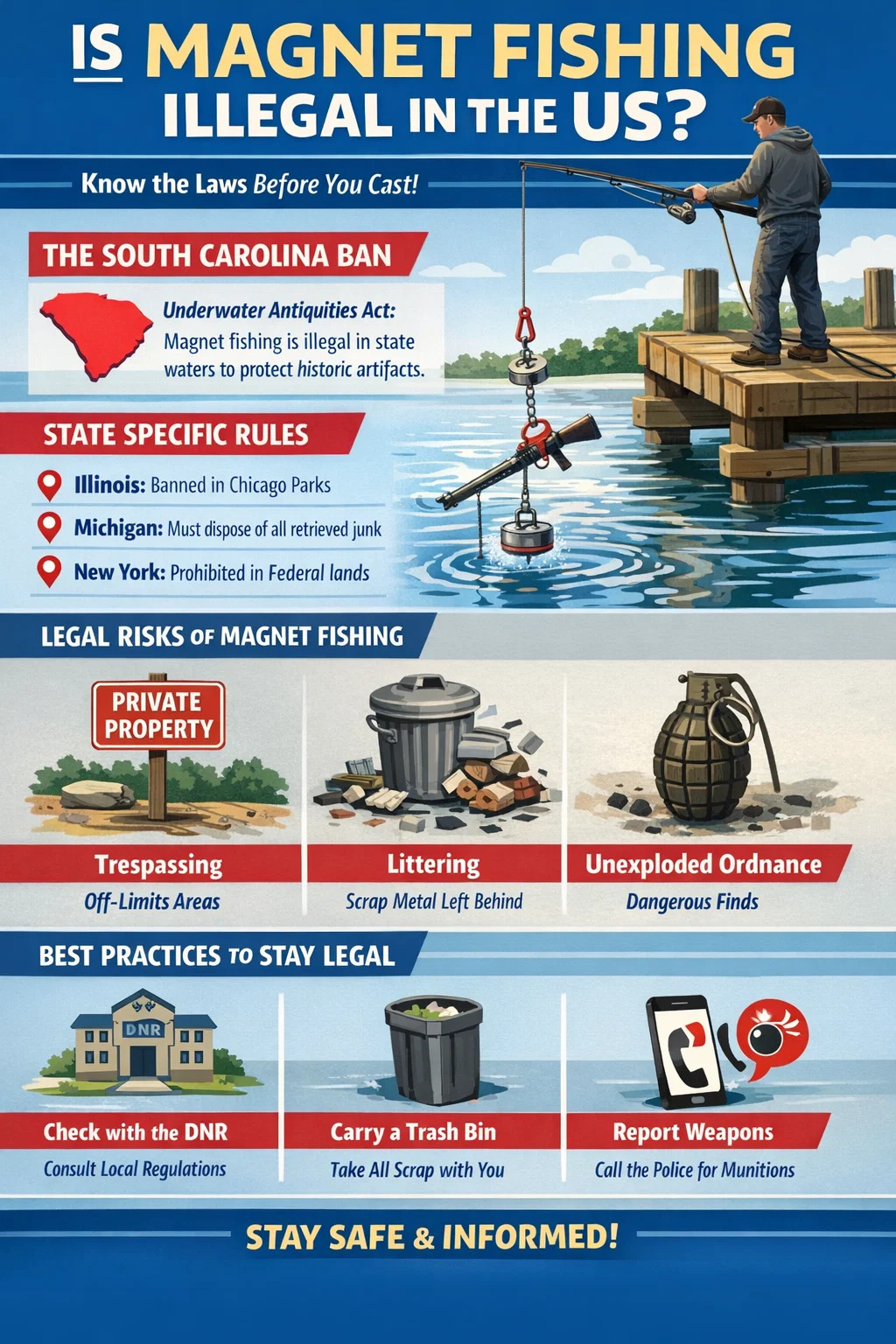 Mıknatıs balıkçılığı federal düzeyde yasa dışı değil Amerika Birleşik Devletleri'nde, ancak belirli eyaletlerde, şehirlerde ve yargı bölgelerinde sıkı bir şekilde düzenleniyor veya tamamen yasaklanıyor. En dikkat çekici yasak ise Güney Karolina Sualtı Eski Eserler Yasası'nın kullanımını yasakladığı durumlarda balıkçılık mıknatısı devlet sularından eserler toplamak. Diğer eyaletlerde yasallık, yerel izinsiz giriş yasalarına, çevrenin korunmasına ve Doğal Kaynaklar Bakanlığı'nın (DNR) talimatlarına bağlıdır.